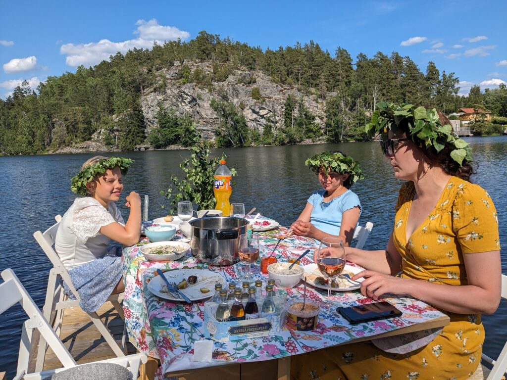 Midsommar i stugan. Lunch på bryggan och frukt på berget. Tuva och natti övade sig på att köra båt.