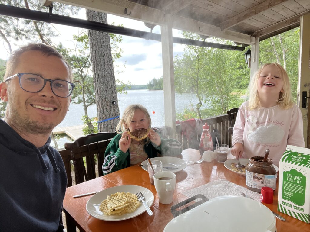Ingrid, Adele och jag är här på spontanbesök. 🙂 Väderutsikten såg bättre ut när vi åkte ut men det har inte hindrat badandet. Kaffebryggare och vattenkokare uppgraderade och en brödröst ingår numera i stugans utrustning. Bara en hårsmån från femstjärnigt nu! Pumpens backventil är rensad också.
