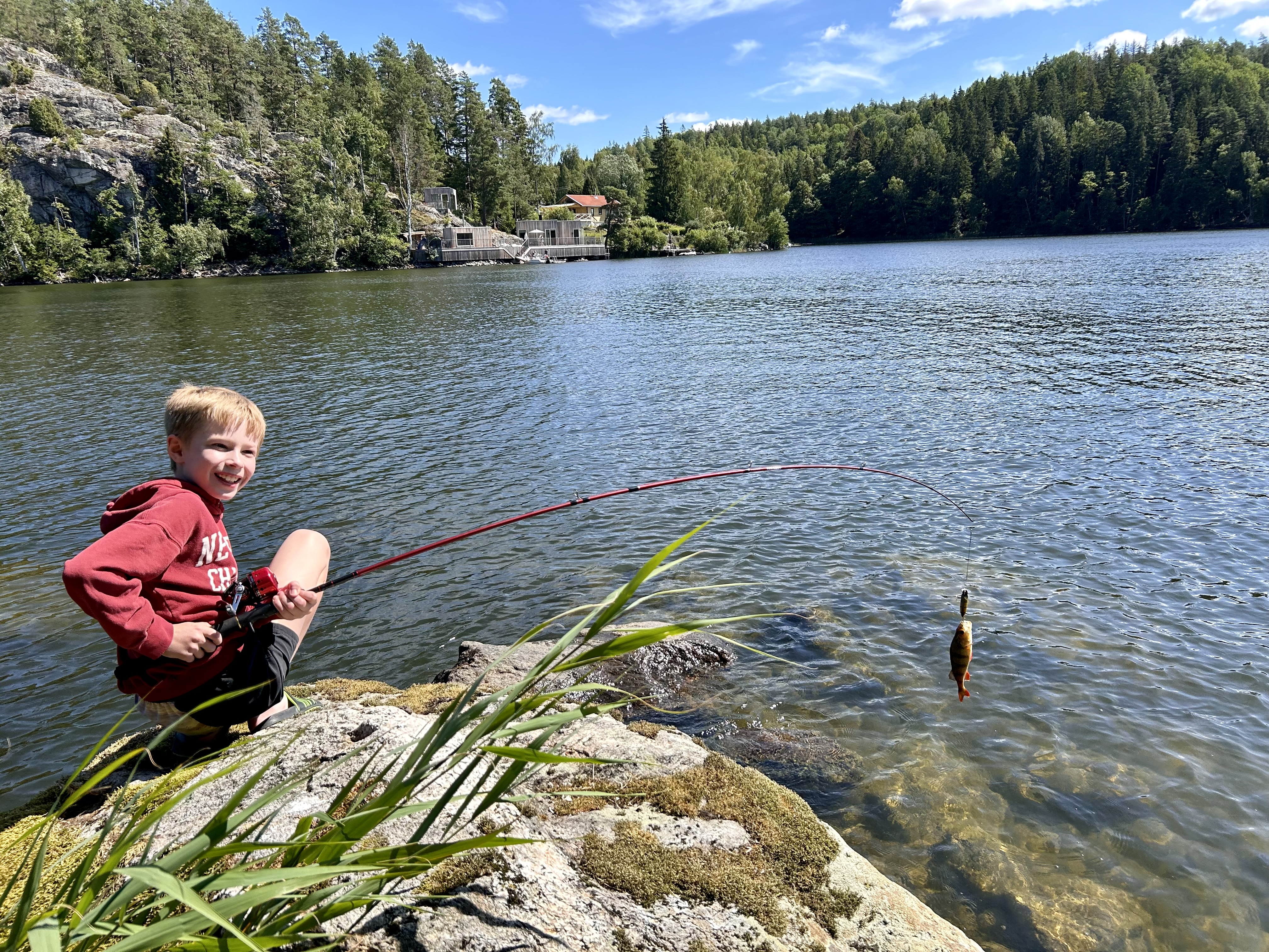 Ljuvlig vecka ute i stugan med nästan 4 dar med toppväder! Julian fick sin första fisk på kastspö, en abborre som vi stekte direkt och åt :).