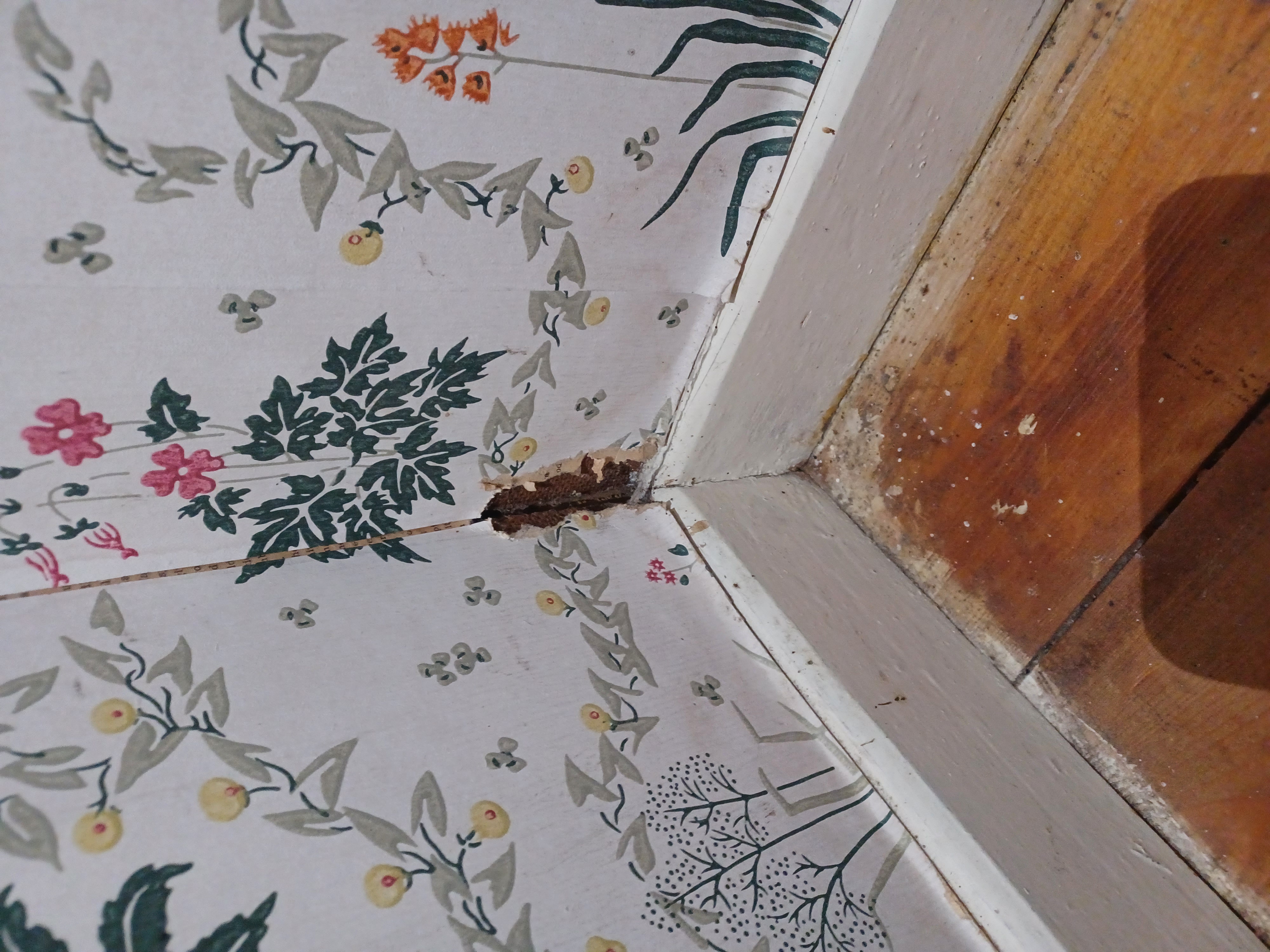 Det har också varit en mus inne som det verkar, eller något annat flitigt djur som har tuggat sig igenom tapeten och lämnat en hög med spån efter sig.