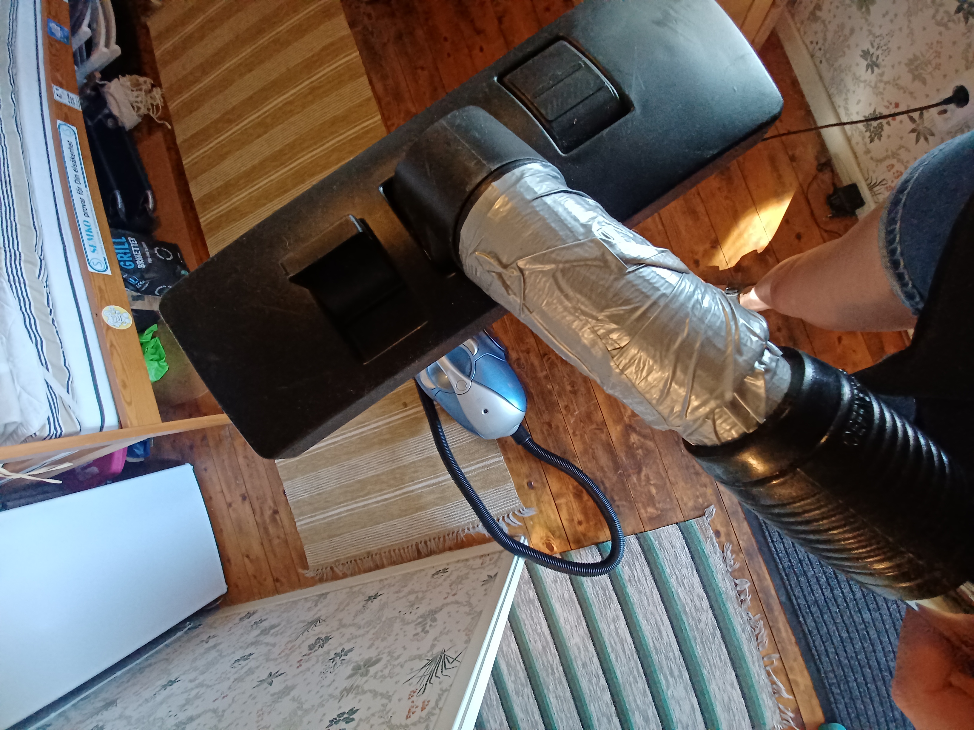 Dammsugaren: den har tidigare varit sprucken i plasten till munstycket, den har suttit fast med snöre men jag tejpade den idag. Den är tät än så länge och dammsuger bra, men man kan ha det i åtanke om man ramlar över en bra smidig dammsugare.